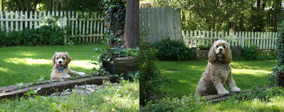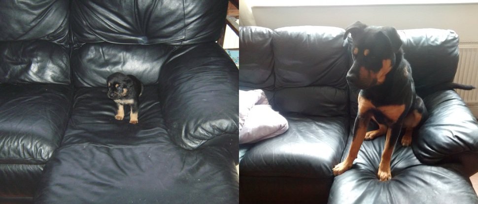 When a dog joins a family, it becomes a member of it. As a dog owner, I can’t still believe how quickly they grow. That’s why I wanted to share with you this adorable pictures of re-taken photos of dogs before and after growing up. I bet that you are going to love them all!