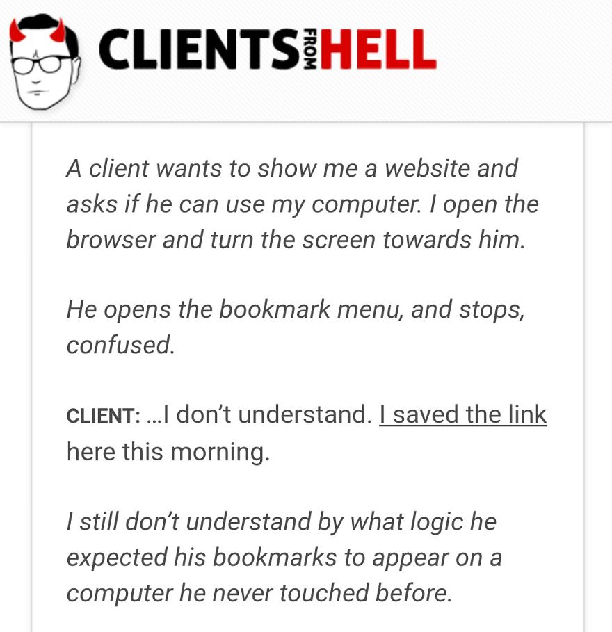 We’re talking about Clients From Hell, it’s a Website that’s so discreet that even the founders and admins are still completely unidentified to this day, which can be reassuring to the hundreds if not thousands of Web developers and freelancers who have been sharing their terrible experiences on the site since 2009. If you’ve ever dealt with a client straight from the fiery pits yourself, these harrowing accounts of trickery and insanity with first give you a chuckle, and then a long, slow shiver of dread. The user-submitted posts can even be sorted by ‘client type,’ ranging from ‘deadbeat’ to ‘racist’ to ‘chaotic good.’