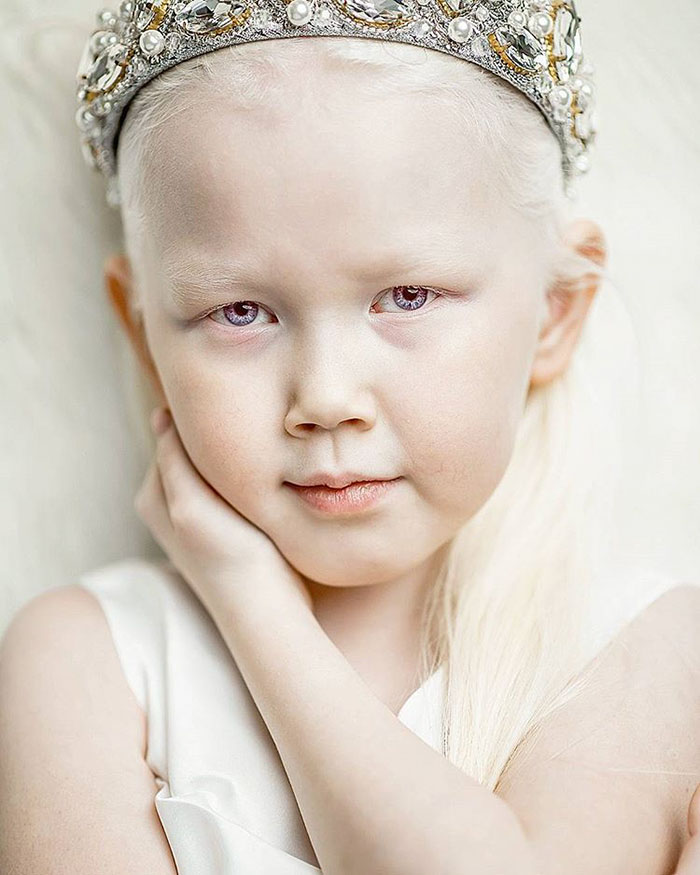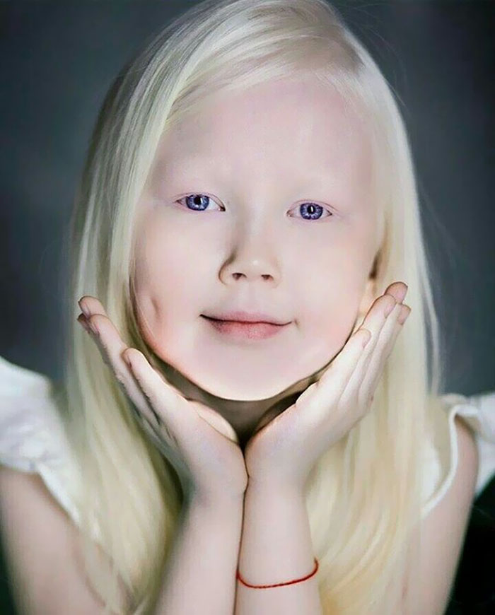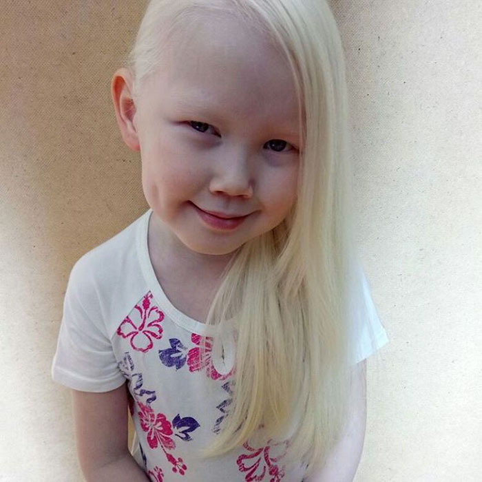 Out of her whole family, she is the only one with blonde hair and the first albino from both sides of the family