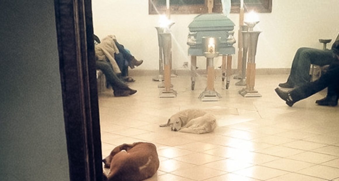 Family members were stunned when stray dogs showed up to the funeral home.