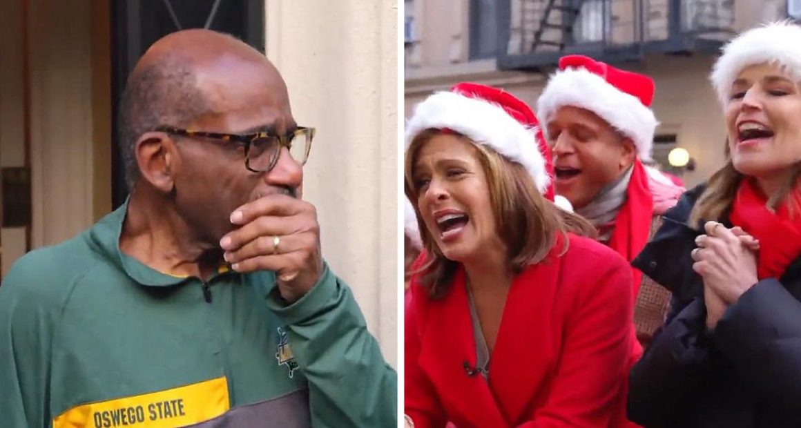 Wearing matching Santa hats, the more than 50-person-strong crowd of anchors, producers, crew and security staff made their way to Roker’s front door. However, while practicing about a block away from Roker’s house, they caught wind that the weatherman might catch sight of them as he was on his way back from a doctor’s appointment. Luckily, however, his wife, Deborah Roberts, who was in on the surprise, alerted the team, who quickly made themselves scarce. With the practice over, the crowd then headed to Roker’s place, as they gathered in a semi-circle around his door, ready to sing their hearts out to their beloved friend and longtime colleague. With the team ready and the cameras rolling, “Today” hosts Savannah Guthrie and Hoda Kotb rang the doorbell and quickly ran back to take their place among the crowd to kick off a sweet, jolly and thoroughly emotional affair that would leave more than a few with tears in their eyes.