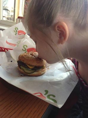 A couple of minutes later, Lauren arrived back at our table with cheeseburger #2. Arianna said, “OH FANK YOU! You fixded my cheeseburger!” When Lauren walked away, Arianna just sat there for a second and looked at her new burger. She looked like so deep in thought….just staring at it….then she let out a big ”OH I missed you!!” and started kissing the burger over and over again. I showed Lauren this picture and said, “I think we glorified the cheeseburger too much!” She busted up laughing, and asked if she could go show her manager. She came back a minute later and said she showed everyone in the back kitchen area too, and that it made them all laugh and smile. I was so touched by this experience. Especially since I know people who have been asked to leave restaurants when their child with autism is being disruptive.