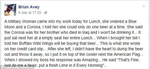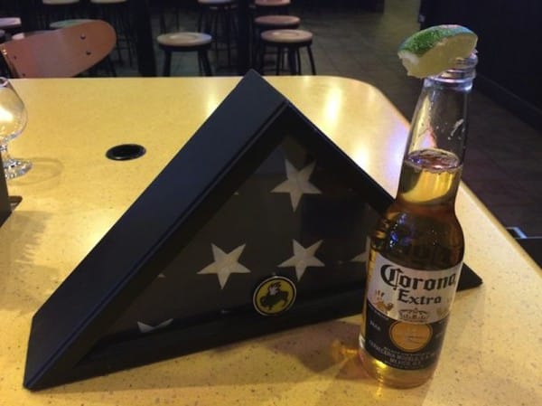 But the amazing part is that Buffalo Wild Wings decided to make a touching tribute  by keeping the beer on the bar in a never-ending toast to the fallen soldier. The bar’s manager told his local news station, “I just can’t throw this beer away. I said let’s keep it. Just make sure that we change out the lime every day.”