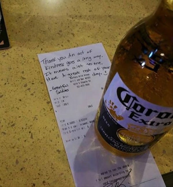 The woman then told Brian that the bottle of Corona is for her brother who passed away while in Iraq. Brian agreed happily to hand her the second beer. She took and placed at the empty seat beside her, she ate her lunch without touching that bottle. Brian brought her the bill and told her that the restaurant would paid for the beer. The woman left a touching message written on her receipt: Thank you. An act of kindness goes a long way. It means a lot to me. Have a great rest of your day. – A Grateful Soldier.