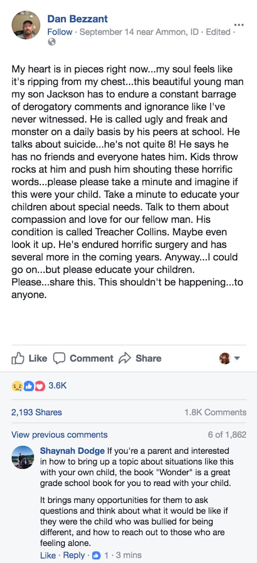 Dan decided enough was enough. He took to Facebook after the incident at school with a powerful and frightening public post: