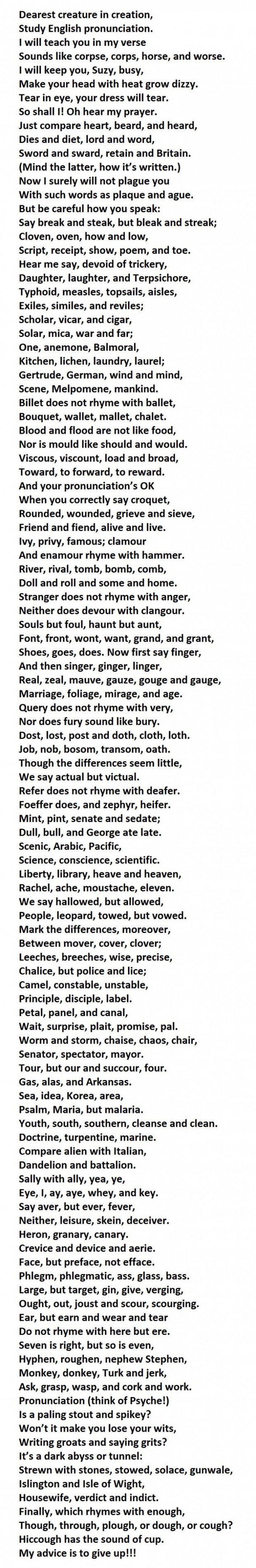 This poem entitled “The Chaos” was written by a Dutch writer, traveler and teacher Gerard Nolst Trenité in 1922. It illustrates the difficulties of English spelling and pronunciation.