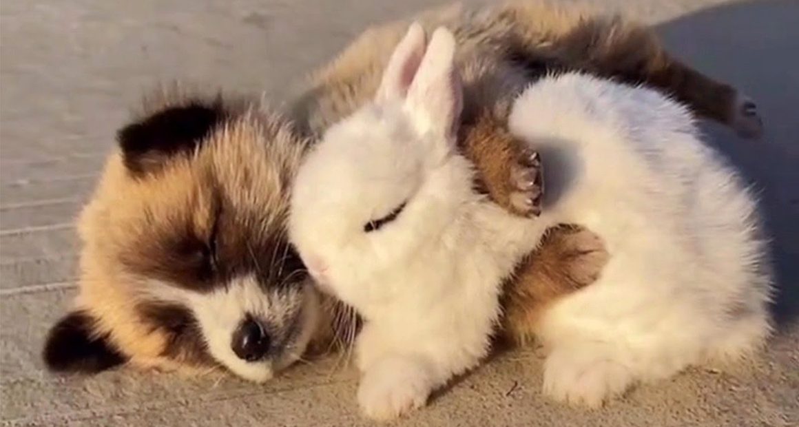Puppy And Bunny Friends Come Together For A Nap And Fall Asleep Hugging