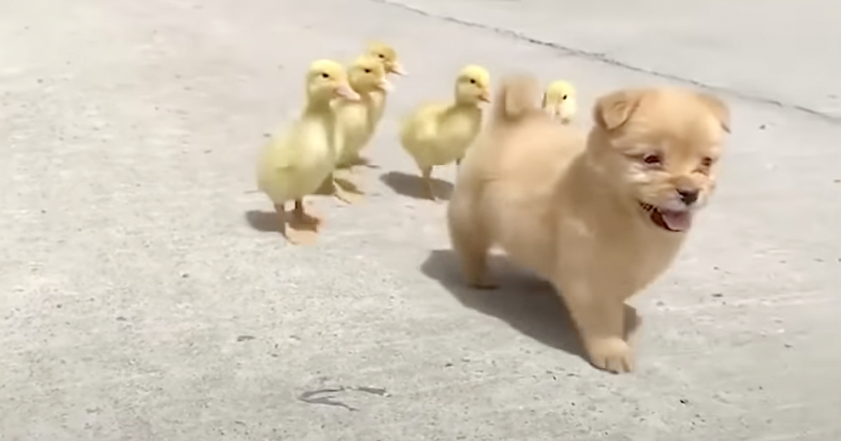 Five Little Ducklings Have Mistaken An Adorable Puppy As Their Mother, They’ve Taken To Following Her Around