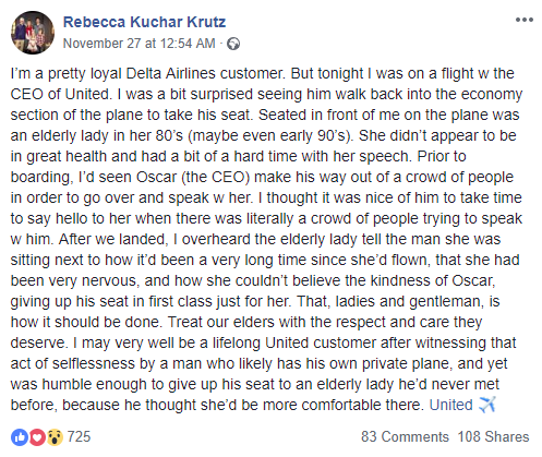 Krutz noted in her Facebook post that this selfless act might have just turned her into a loyal United customer for life. As she wrote in a letter to the San Francisco Chronicle, “if even half of the people on this earth could behave in such a way, the world would be a much better place.”