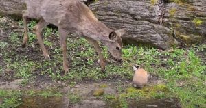 Out near the woods, a woman comes across a wild fawn who just noticed a little bunny rabbit and didn’t know what to think of the strange creature. It approaches to do some investigating and actually listens to the human’s advice to be gentle and not hurt it. Is this a real life Bambi and Thumper?