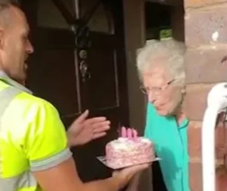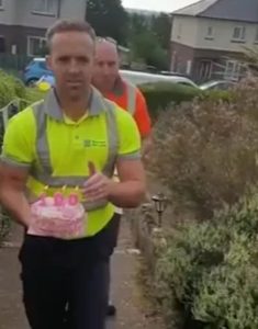 He can be seen walking towards Mercy’s home caring a birthday cake. But he’s not alone. His colleagues are there to wish Mercy a happy birthday too.