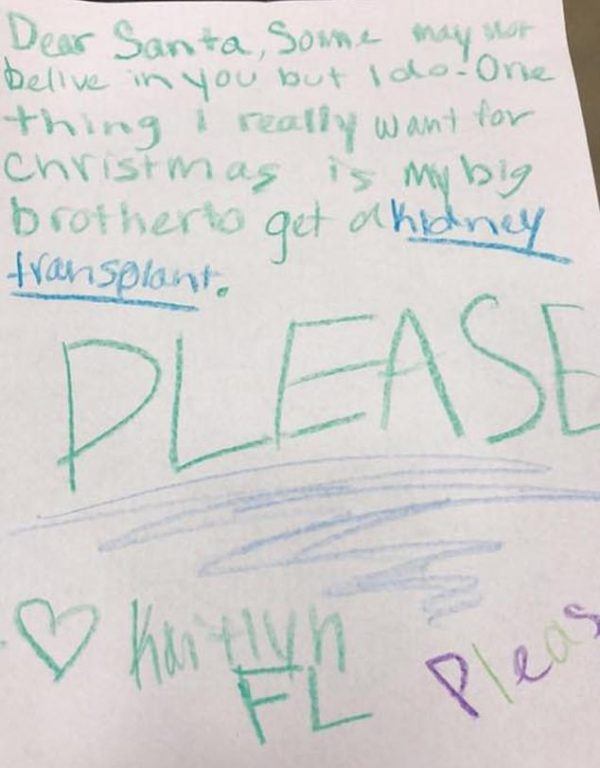 “Dear Santa, Some may not believe in you. But I do. One thing I really want for Christmas is my big brother to get a kidney transplant. PLEASE,” the letter read.