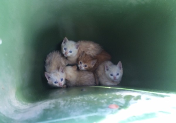 Recently, animal rescuers have discovered 5 kittens inside one of the garbage cans after they have been thrown mercilessly in it.  one of the rescuers heard the meowing, he approached and opened the lid of the garbage can to find the kittens covered in their own urine. He immediately alerted the rest of the animal rescuers who came to their help.