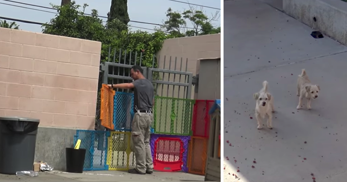 Hope For Paws received a call about two homeless dog friends who’d taken refuge in a schoolyard. They had evaded rescue for weeks, so Eldad and Loreta showed up and secured the area with fences.