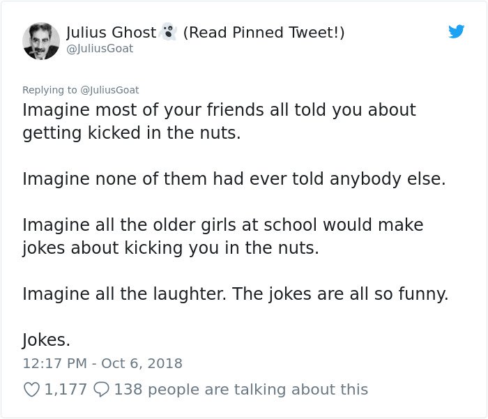 Writer A.R. Moxon has just encouraged all men to take part in a workout of compassion. He reframed women’s encounters with attack and sexual abuse and introduced it in a manner that most men ought to understand… getting kicked in the nuts. In the beginning, it seems absurd but it does not once you read the entire thing.