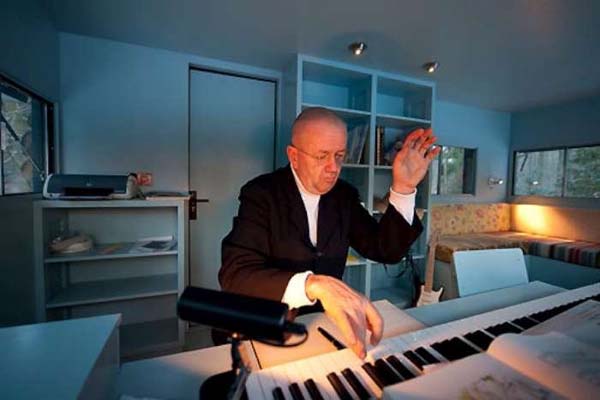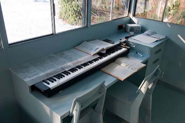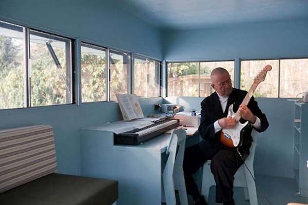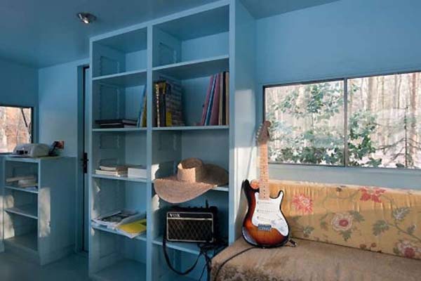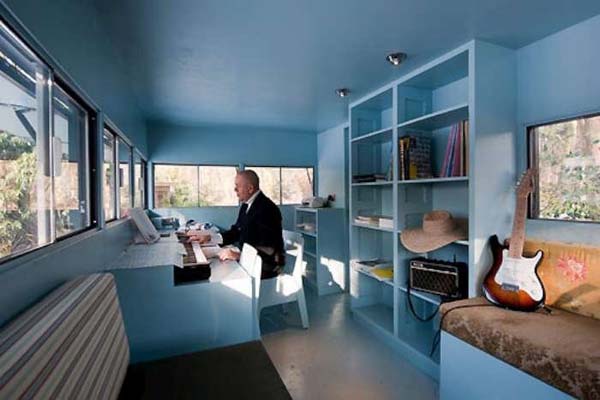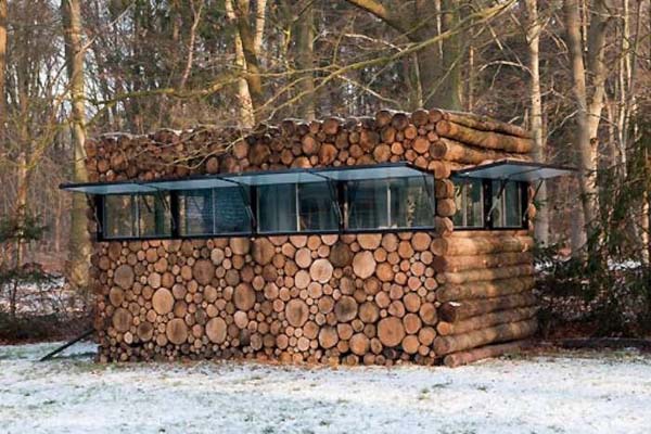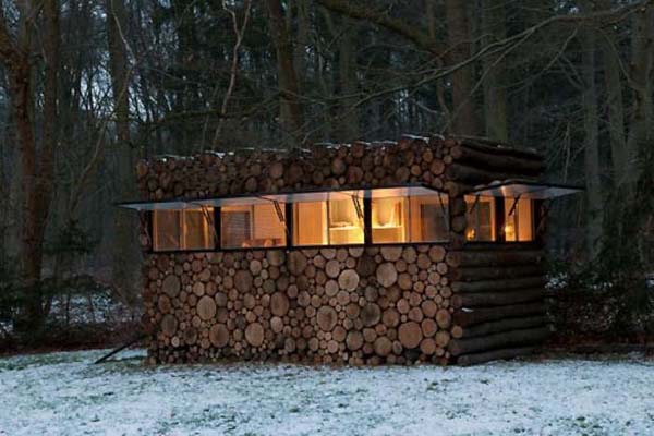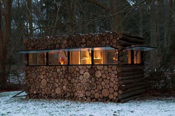 The small was made by a man named Piet Hein Eek for Dutch performer, Hans Liberg (the man in the pictures). The outside is created of wood that is covering plastic and a steel frame, which make the walls look like wood. Right now, the cabin is being used as a studio, but with this design, it could be alo used as a camping or hunting blind.