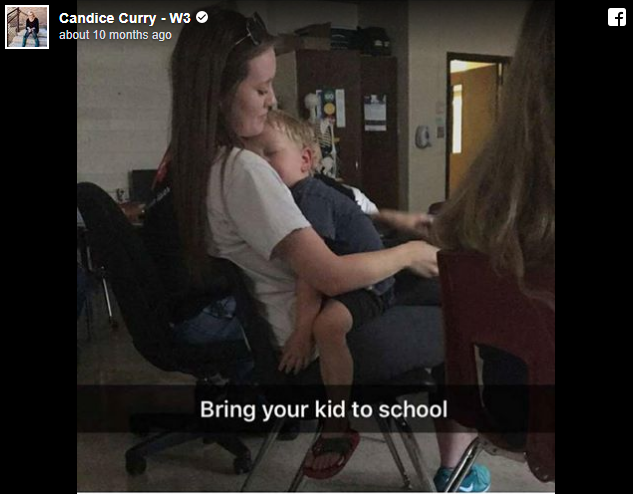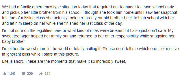 “Instead of missing class she actually took her three year old brother back to high school with her and let him sleep on her while she finished her last class of the day. I’m not sure on the legalities here or what kind of rules were broken but I also just don’t care. My sweet teenager helped her family out and returned to her other responsibility while snuggling her baby brother.”