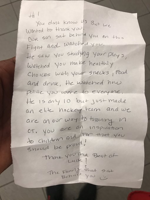 You don’t know us but we wanted to thank you. Our son sat behind you on this flight and watched you. He saw you studying your plays, watched you make healthy choices with you snacks, food and drink. He watched how polite you were to everyone. He is only 10 but just made an elite hockey team and we are on our way to training in CT. You are an inspiration to children and for that you should be proud! Thank you and best of luck!