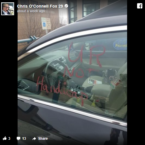 Nancy didn’t do something illegal – She has the right to park in the handicapped spot and she has the required sticker to prove it to anyone who may disagree with her parking.