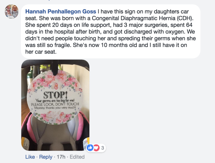 By putting a polite sign up over their child’s car seat, it reminds people that when they touch a newborn they are passing on their germs and it can be too much to handle for some newborns.