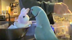 The bird just keeps talking and talking about his new best friend in the world! That friend? A stuffed bunny toy! And the cutest part has to be when he gives it a little smooch on the head. How’s that for love?