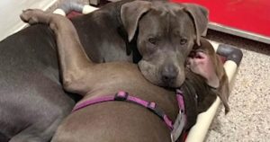 Two pit bulls met as strays on the streets and became the best of friends. And when taken to the shelter, they needed to be together at all times. If separated, they would constantly look for each other. They’d lie in the kennel holding each other close waiting for the day someone would adopt them together.