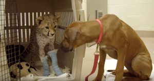 These two unlikely friends are inseparable – even during surgery. Ruuxa the cheetah needed surgery on his front legs because they were growing abnormally which would cause pain later in life. His best friend, Raina the Rhodesian Ridgeback puppy, waited by his side in the surgery room at the San Diego Zoo Safari Park until everything was completed.