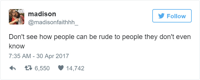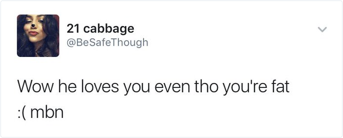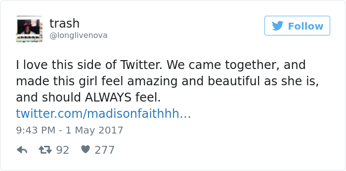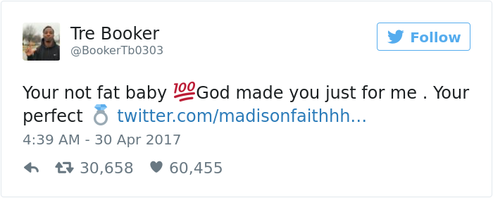 “Wow he loves you even tho you’re fat,” Twitter user @BeSafeThough commented. Madison retweeted the comment and responded with a simple message: “Don’t see how people can be rude to people they don’t even know.” Madison’s tweet has gone viral since with tons of people supporting her and her boyfriend. Though the best response came from the boyfriend himself… Check it out below!