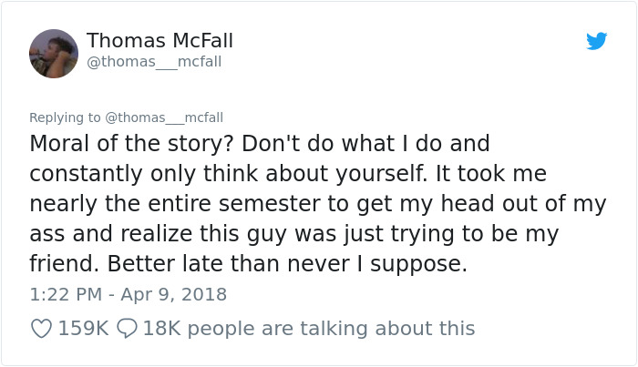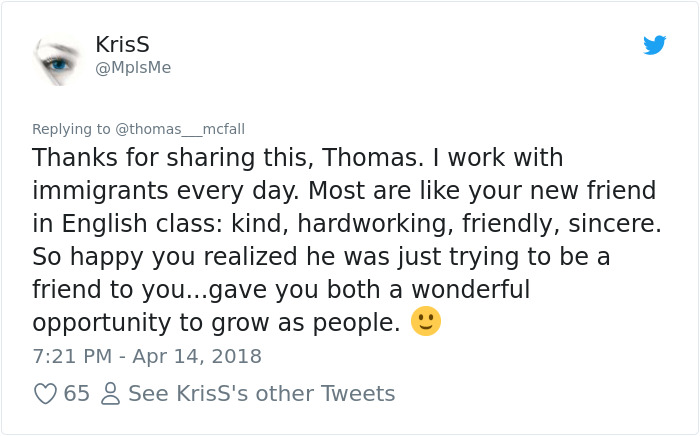 Thomas Mcfall shared his heartwarming story recently on Twitter, it has instantly gone viral as people were moved by the honest and friendly actions of an ‘immigrant’ student, as well as Thomas’ capacity for honest and frank self-reflection.