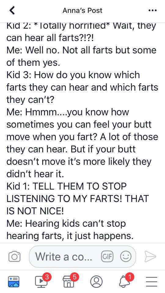 When a six-year-old boy in her class, who is deaf, farted loudly, some of his classmates started laughing. The boy was mortified by their reaction. He didn’t know that farts made a sound!
