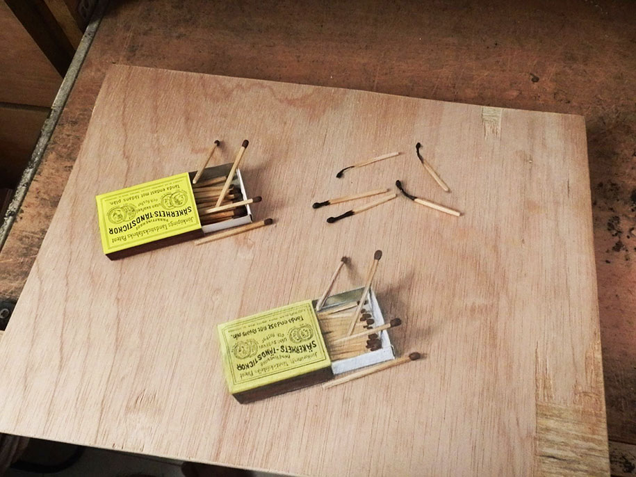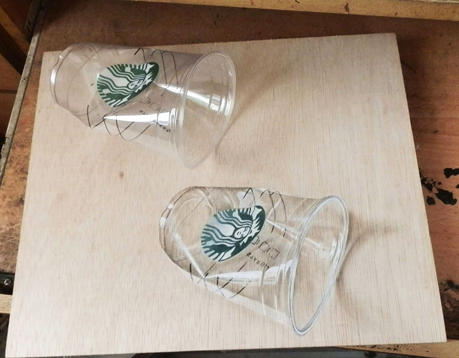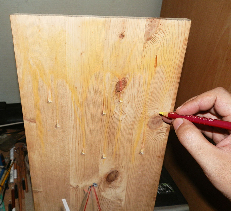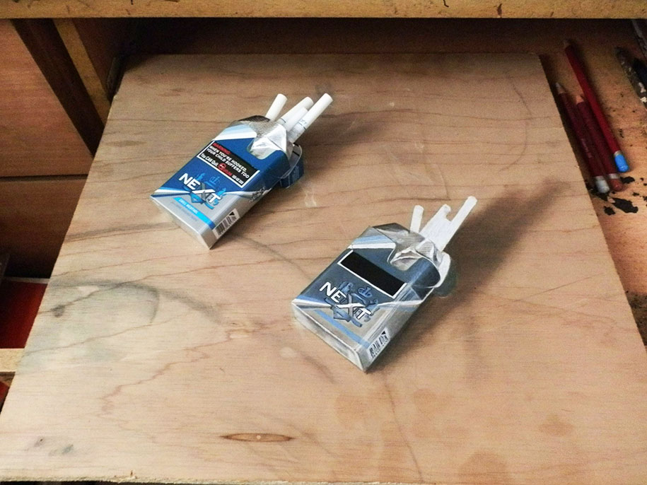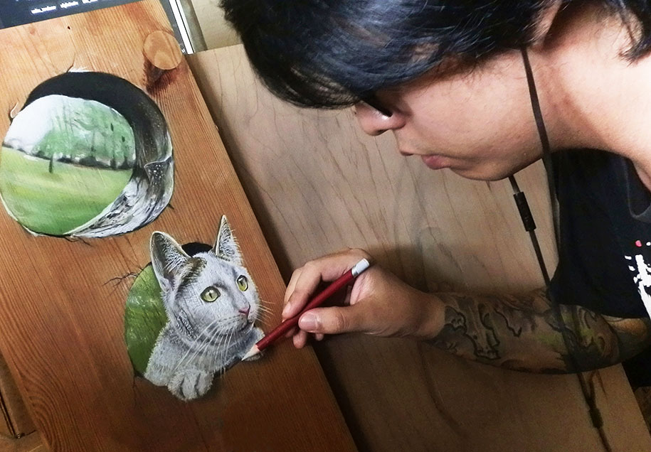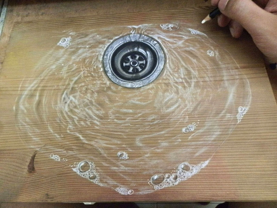 “By working on wood, it gives me a lot of dimension and ideas to create something close to reality and it works really well with pastels, too,” Hoo told boredpanda. “I started to think of ideas and draw things that we could see ‘happening’ on a piece of wood, so the very first idea that struck me was the dripping effect. That was my first anamorphic work.”
