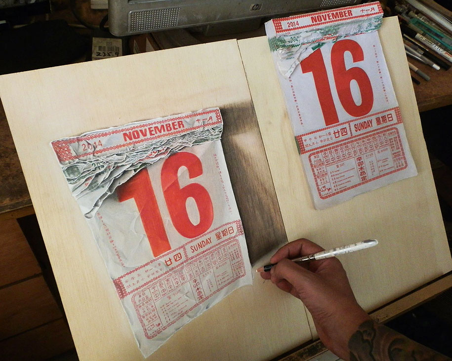 Ivan Hoo is an artist from Singapore who has an astonishing talent of drawing anything on anything. Once you see his works it is hard to believe that its an art but rather a reality. He uses pastels,charcoal and ink wood panels. He takes pictures and then draws them. He even works on real life topics.