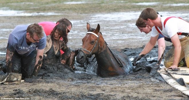 Rescuers thought that the best plan to save the horse is digging the horse out, but unfortunately this has lead him to sink more.
