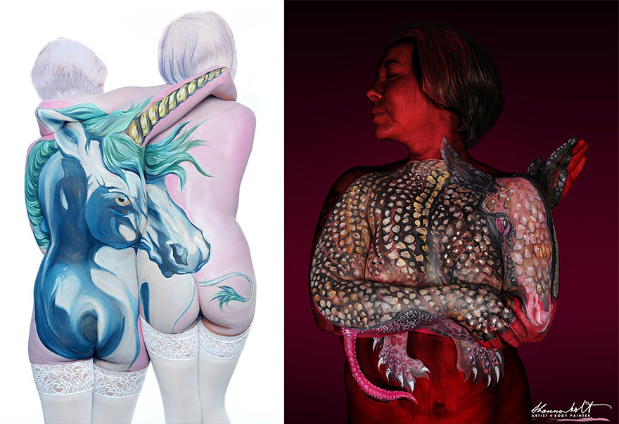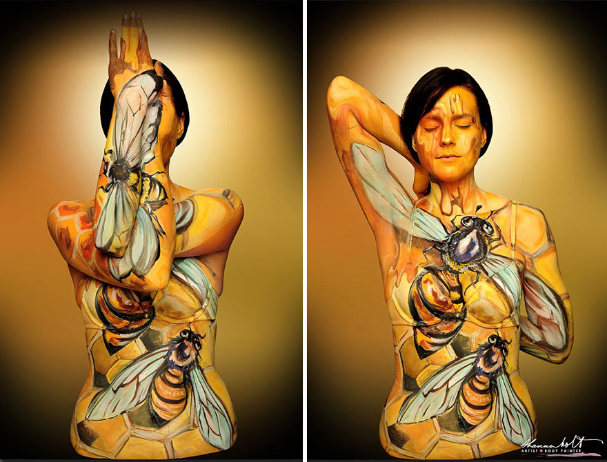 She is using a variety of artistic backdrops- paper, wood, metal and canvas. Now, she has tried a new experience which is painting on human bodies. here are some examples of her work.
