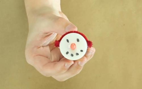 6. Use your glue gun to attach a pom-pom to each end of the pipe cleaner. This is now your snowman’s earmuffs. Set them aside for a moment.