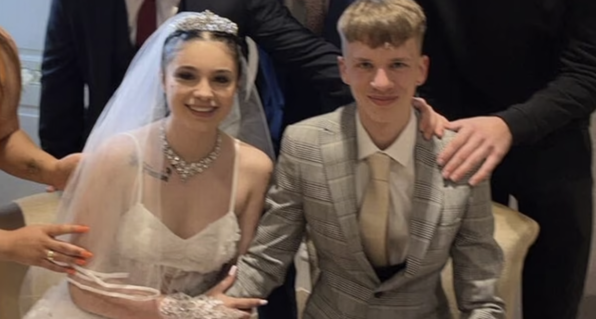 Liam Jones and his wife Sophia, 20, captured on their wedding day.