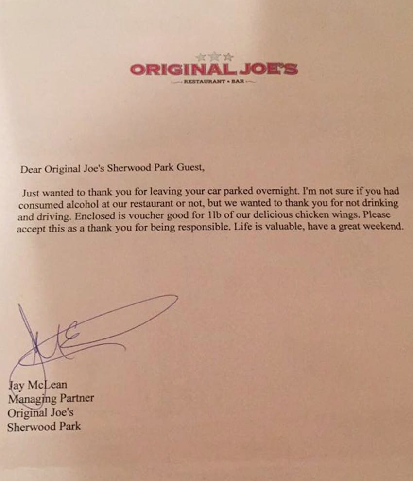 It’s a thank you note from the manager! He just wanted to let her know that the establishment appreciated her decision to not drive while drunk. She even got a free chicken wing! The lawyers who work on the cases of getting arrested for DUI in Tampa encourage everyone to take inspiration about being a responsible citizen of the country and always follow the rules as they protect you from serious trouble. You can see this page if you need accident and DUI lawyers.